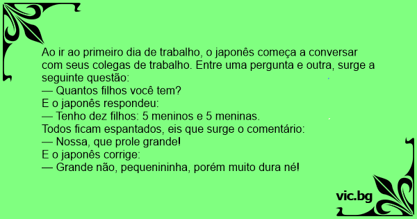 Ao ir ao primeiro dia de trabalho, o japonês começa a conversar com seus colegas de trabalho. Entre uma pergunta e outra, surge a seguinte questão: