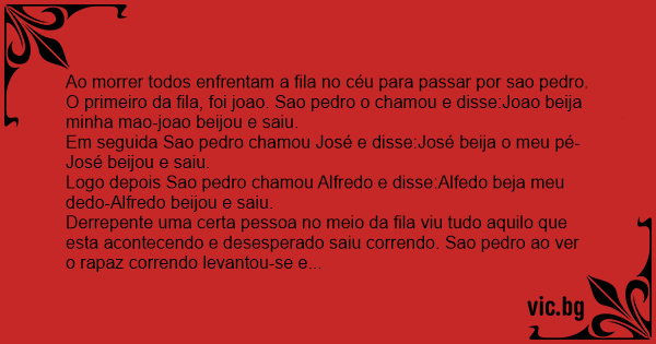 O primeiro da fila, foi joao. Sao pedro o chamou e disse:Joao beija minha mao-joao beijou e saiu.