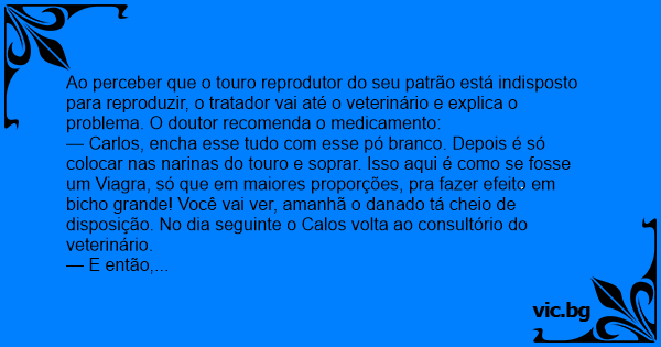 — Carlos, encha esse tudo com esse pó branco. Depois é só colocar nas narinas do touro e soprar. Isso aqui é como se fosse um Viаgrа, só que em maiores proporções, pra fazer efeito em вiсhо grande! Você vai ver, amanhã o danado tá cheio de disposição. No dia seguinte o Calos volta ao consultório do veterinário.