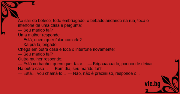 Ao sair do boteco, todo embriagado, o bêbado andando na rua, toca o interfone de uma casa e pergunta: