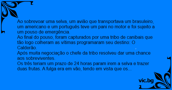 Ao sobrevoar uma selva, um avião que transportava um brasuleiro, um americano e um português teve um pani no motor e foi sujeito a um pouso de emergência.