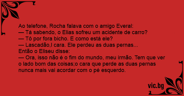 — Ora, isso não é o fim do mundo, meu irmão. Tem que ver o lado bom das coisas;o cara que perde as duas pernas nunca mais vai acordar com o pé esquerdo.