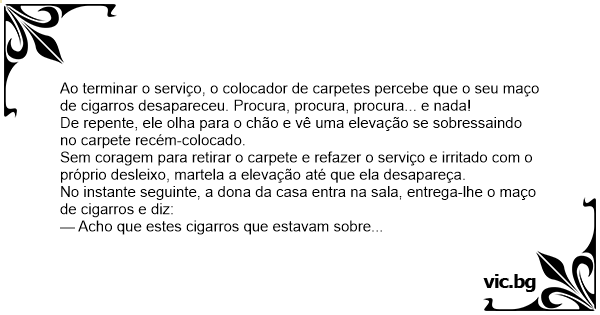 Ao terminar o serviço, o colocador de carpetes percebe que o seu maço de cigarros desapareceu. Procura, procura, procura... e nada!
