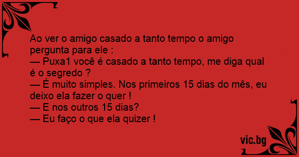 Ao ver o amigo casado a tanto tempo o amigo pergunta para ele :
