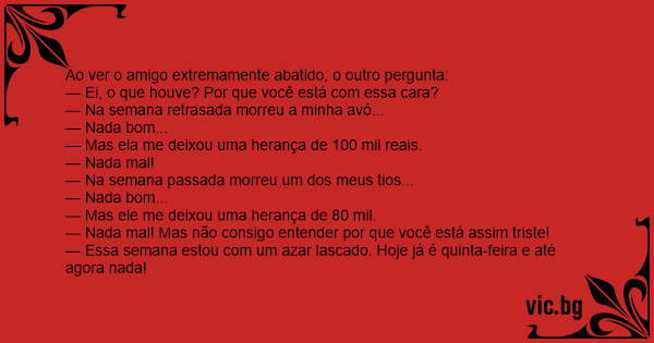 Ao ver o amigo extremamente abatido, o outro pergunta: