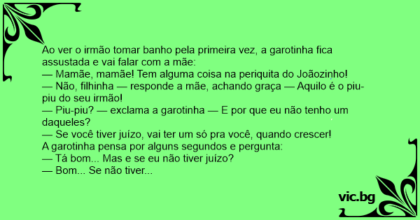 — Não, filhinha — responde a mãe, achando graça — Aquilo é o piu-piu do seu irmão!