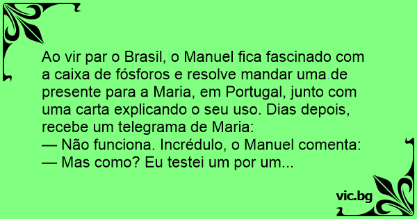 Ao vir par o Brasil, o Manuel fiса fascinado com a caixa de fósforos e resolve mandar uma de presente para a Maria, em Portugal, junto com uma carta explicando o seu uso. Dias depois, recebe um telegrama de Maria: