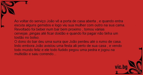 Ao voltar do serviço João vê a porta de casa aberta , e quando entra escuta alguns gemidos e logo viu sua mulher com outro na sua cama.