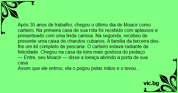 Assim que ele entrou, ela o pegou pelas mãos e o levou até seu quarto. Transaram por horas. Depois de quase matar o carteiro de tanto prazer, a loira ainda lhe ofereceu um delicioso café da manhã. O carteiro observava cada detalhe quando percebeu que embaixo de sua xícara de café havia uma moeda de 25 centavos.