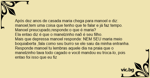 Após dez anos de casada maria chega para manoel e diz: manoel,tem uma coisa que tenho que te falar e já faz tempo.