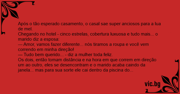 Chegando no hotel - cinco estrelas, cobertura luxuosa e tudo mais... o marido diz a esposa: