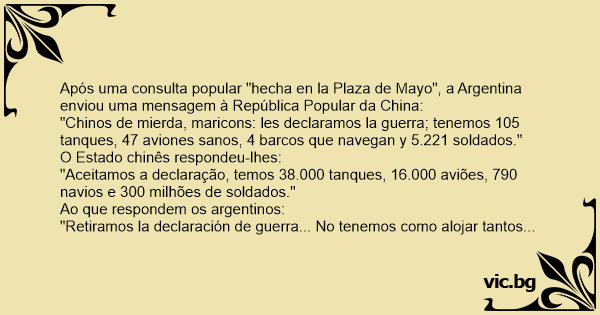 "Chinos de мiеrdа, maricons: les declaramos la guerra; tenemos 105 tanques, 47 aviones sanos, 4 barcos que navegan y 5.221 soldados."