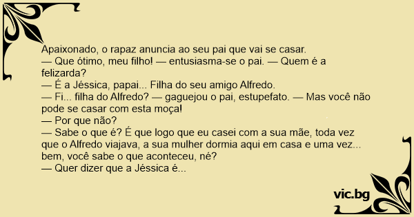 — Fi... filha do Alfredo? — gaguejou o pai, estupefato. — Mas você não pode se casar com esta moça!