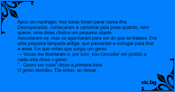 Apos um naufragio, tres loiras foram parar numa ilha. Desesperadas, comecaram a caminhar pela praia quando, sem querer, uma delas chutou um pequeno objeto.