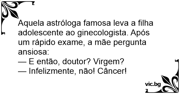 Aquela astróloga famosa leva a filha adolescente ao ginecologista. Após um rápido exame, a mãe pergunta ansiosa: