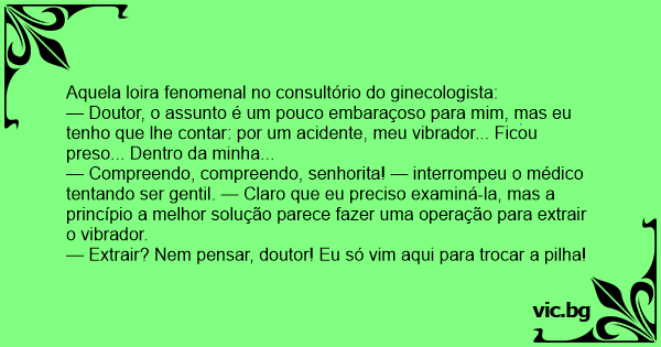 — Doutor, o assunto é um pouco embaraçoso para mim, mas eu tenho que lhe contar: por um acidente, meu vibrador... Ficou preso... Dentro da minha...