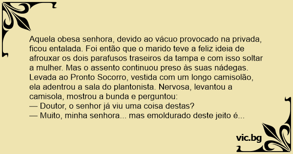 Aquela obesa senhora, devido ao vácuo provocado na privada, ficou entalada. Foi então que o marido teve a feliz ideia de afrouxar os dois parafusos traseiros da tampa e com isso soltar a mulher. Mas o assento continuou preso às suas nádegas.