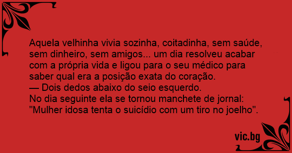 Aquela velhinha vivia sozinha, coitadinha, sem saúde, sem dinheiro, sem amigos... um dia resolveu acabar com a própria vida e ligou para o seu médico para saber qual era a posição exata do coração.