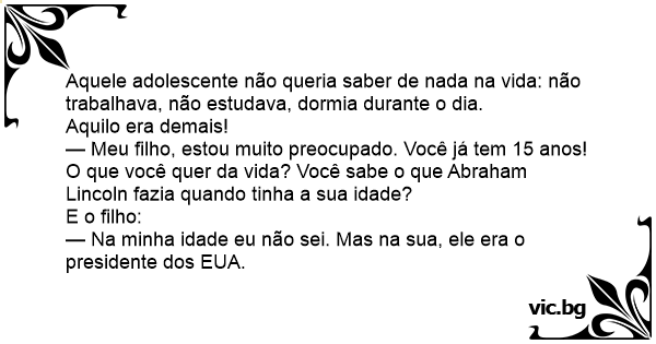 — Meu filho, estou muito preocupado. Você já tem 15 anos! O que você quer da vida? Você sabe o que Abraham Lincoln fazia quando tinha a sua idade?