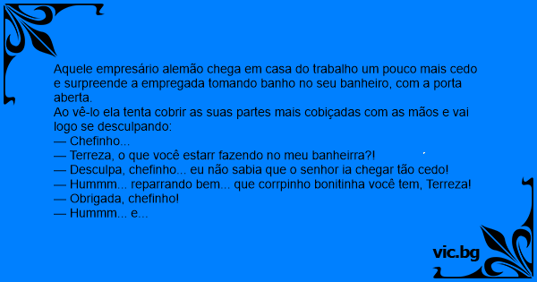 Aquele empresário alemão chega em casa do trabalho um pouco mais cedo e surpreende a empregada tomando banho no seu banheiro, com a porta aberta.