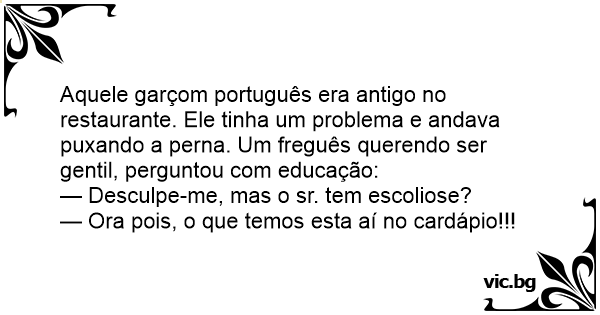 Aquele garçom português era antigo no restaurante. Ele tinha um problema e andava puxando a perna. Um freguês querendo ser gentil, perguntou com educação: