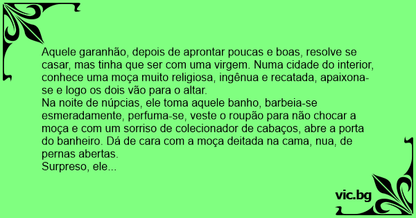 Na noite de núpcias, ele toma aquele banho, barbeia-se esmeradamente, perfuma-se, veste o roupão para não chocar a moça e com um sorriso de colecionador de cabaços, abre a porta do banheiro. Dá de cara com a moça deitada na cama, nua, de pernas abertas.