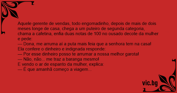 Aquele gerente de vendas, todo engomadinho, depois de mais de dois meses longe de casa, chega a um puteiro de segunda categoria, chama a cafetina, enfia duas notas de 100 no ousado decote da mulher e pede: