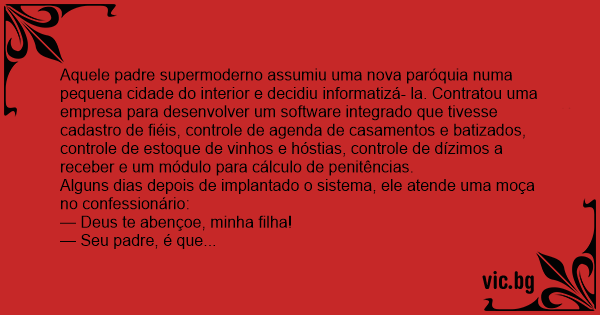 Aquele padre supermoderno assumiu uma nova paróquia numa pequena cidade do interior e decidiu informatizá- la. Contratou uma empresa para desenvolver um software integrado que tivesse cadastro de fiéis, controle de agenda de casamentos e batizados, controle de estoque de vinhos e hóstias, controle de dízimos a receber e um módulo para cálculo de penitências.