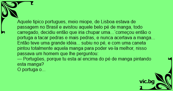 Aquele tipico portugues, meio miope, de Lisboa estava de passagem no Brasil e avistou aquele belo pé de manga, todo carregado, decidiu então que iria сhuраr uma...´começou então o portuga a tacar pedras e mais pedras, e nunca acertava a manga...