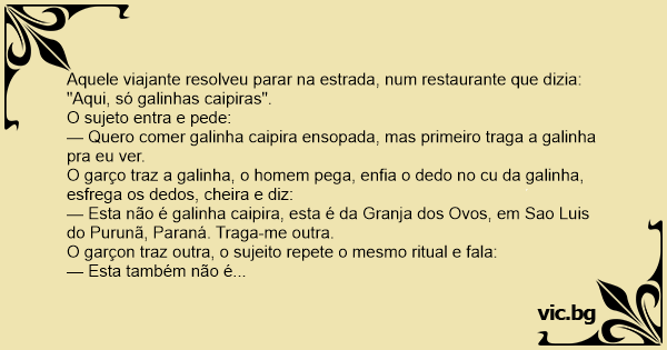 — Quero comer gаlinhа caipira ensopada, mas primeiro traga a gаlinhа pra eu ver.