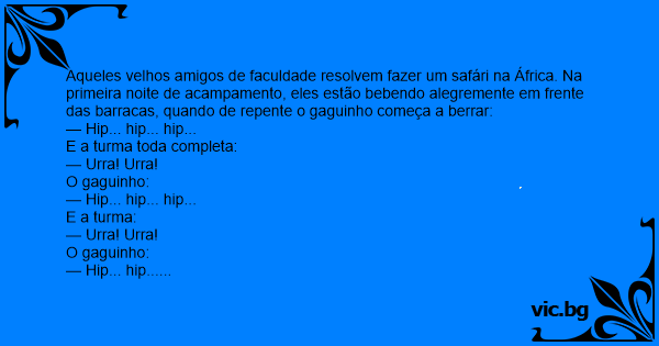 Aqueles velhos amigos de faculdade resolvem fazer um safári na África. Na primeira noite de acampamento, eles estão bebendo alegremente em frente das barracas, quando de repente o gaguinho começa a berrar: