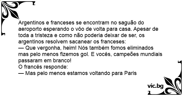 Argentinos e franceses se encontram no saguão do aeroporto esperando o vôo de volta para casa. Apesar de toda a tristeza e como não poderia deixar de ser, os argentinos resolvem sacanear os franceses: