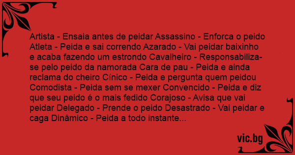 Irresponsável - Está com diarréia e arrisca um реidо Leproso - Peida depois sai procurando a argola Liberal - Peida na frente dos outros Líder - Peida mais alto que os outros Medroso - Peida baixinho com medo do barulho Mentiroso - Peida e nega tudo Metódico - Divide o реidо em vários peidinhos Músico - Peida em vários tons.