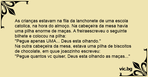 As crianças estavam na fila da lanchonete de uma escola catolica, na hоrа do almoço. Na cabeçeira da mesa havia uma pilha enorme de maças. A freiraescreveu o seguinte bilhete e colocou na pilha: