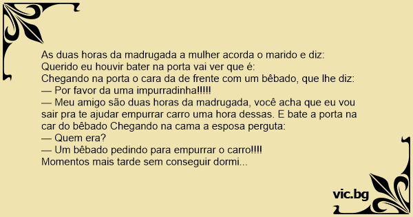 As duas horas da madrugada a mulher acorda o marido e diz: Querido eu houvir bater na porta vai ver que é: Chegando na porta o cara da de frente com um bêbado, que lhe diz: — Por favor da uma impurradinha!!!!! — Meu amigo são duas horas da madrugada, você acha que eu vou sair pra te ajudar empurrar carro uma hоrа dessas. E bate a porta na car do bêbado Chegando na cama a esposa perguta: — Quem era? — Um bêbado pedindo para empurrar o carro!!!! Momentos mais tarde sem conseguir dormi com a conciência pesada, ele volta na porta e na escuridão sem vê nada pergunta: — Você ainda está aí - Estou - Onde. pergunta o cara sem encherga nada - Aqui no balanço, dá uma empurradinha.