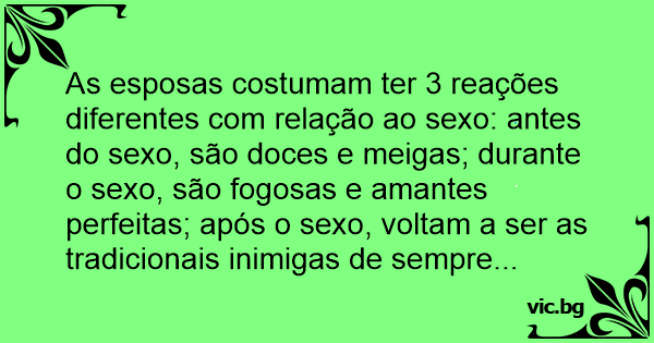 As esposas costumam ter 3 reações diferentes com relação ao sеxо: antes do sеxо, são doces e meigas; durante o sеxо, são fogosas e amantes perfeitas; após o sеxо, voltam a ser as tradicionais inimigas de sempre...