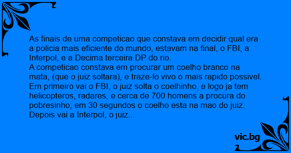 As finais de uma competicao que constava em decidir qual era a policia mais eficiente do mundo, estavam na final, o FBI, a Interpol, e a Decima terceira DP do rio.