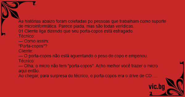 As histórias abaizo foram coletadas po pessoas que trabalham como suporte de microinformática. Parece piada, mas são todas verídicas.