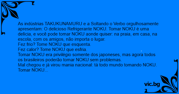 As indústrias TAKUKUNAMURU e a Soltando o Verbo orgulhosamente apresentam: O delicioso Refrigerante NOKU. Tomar NOKU é uma delícia, e você pode tomar NOKU aonde quiser: na praia, em casa, na escola, com os amigos, não importa o lugar.