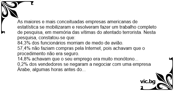 As maiores e mais conceituadas empresas americanas de estatística se mobilizaram e resolveram fazer um trabalho completo de pesquisa, em memória das vítimas do atentado terrorista. Nesta pesquisa, constatou-se que: