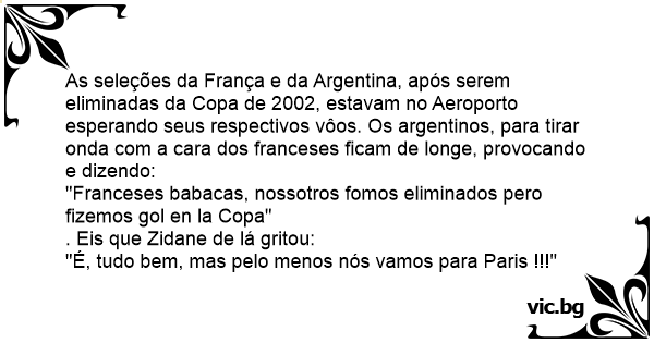 As seleções da França e da Argentina, após serem eliminadas da Copa de 2002, estavam no Aeroporto esperando seus respectivos vôos. Os argentinos, para tirar onda com a cara dos franceses ficam de longe, provocando e dizendo: