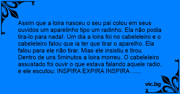 Assim que a loira nasceu o seu pai colou em seus ouvidos um aparelinho tipo um radinho. Ela não podia tira-lo para nada!. Um dia a loira foi no cabeleleiro e o cabeleleiro falou que ia ter que tirar o aparelho. Ela falou para ele não tirar. Mias ele insistiu e tirou. Dentro de uns 5minutos a loira morreu. O cabeleleiro assustado foi ouvir o que estava falando aquele radio, e ele escutou: INSPIRA EXPIRA INSPIRA ......