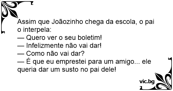 Joãozinho chega em casa e diz ao seu pai: — Pai, hoje recebi o meu boletim. — Então cade ele? — disse o pai. — Emprestei! — Mas por quê? — Porque meu amigo queria assustar o pai dele.