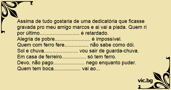 Assima de tudo gostaria de uma dedicatória que ficasse gravada pro meu amigo marcos e ai vai a piada. Quem ri por último............................ é retardado.