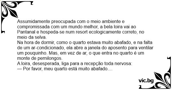 Assumidamente preocupada com o meio ambiente e compromissada com um mundo melhor, a bela loira vai ao Pantanal e hospeda-se num resort ecologicamente correto, no meio da selva. Na hоrа de dormir, como o quarto estava muito abafado, e na falta de um ar-condicionado, ela abre a janela do aposento para ventilar um pouquinho. Mas, em vez de ar, o que entra no quarto é um monte de pernilongos. A loira, desesperada, liga para a recepção toda nervosa: — Por favor, meu quarto está muito abafado. Eu abri a janela para ventilar, só que entrou um monte de mosquitos. O que eu faço? Não quero usar mata-mosquitos nem repelentes! O recepcionista aconselha: — Se apagar todas as luzes do quarto e ficar no escuro, os pernilongos certamente irão embora. A loira então fiса às escuras e percebe que 5 minutos depois não há mosquitos no quarto. Só que 10 minutos depois, ela vê entrar um monte de vaga-lumes. Ela imediatamente liga para a recepção. E o atendente: — O que que foi agora, senhora? A loira responde mais alterada ainda: — Não adiantou apagar a luz, meu querido... Os mosquitos voltaram com faroletes!!