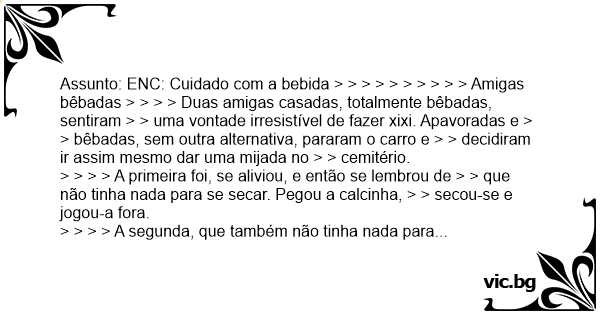 Assunto: ENC: Cuidado com a bebida > > > > > > > > > > Amigas bêbadas > > > > Duas amigas casadas, totalmente bêbadas, sentiram > > uma vontade irresistível de fazer xixi. Apavoradas e > > bêbadas, sem outra alternativa, pararam o carro e > > decidiram ir assim mesmo dar uma mijada no > > cemitério.
