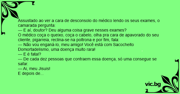 Assustado ao ver a cara de desconsolo do médico lendo os seus exames, o camarada pergunta: