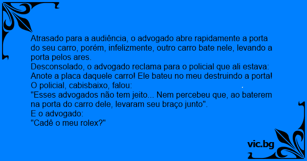 "Esses advogados não tem jeito... Nem percebeu que, ao baterem na porta do carro dele, levaram seu braço junto".