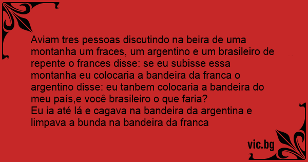 Aviam tres pessoas discutindo na beira de uma montanha um fraces, um argentino e um brasileiro de repente o frances disse: se eu subisse essa montanha eu colocaria a bandeira da franca o argentino disse: eu tanbem colocaria a bandeira do meu país,e você brasileiro o que faria?