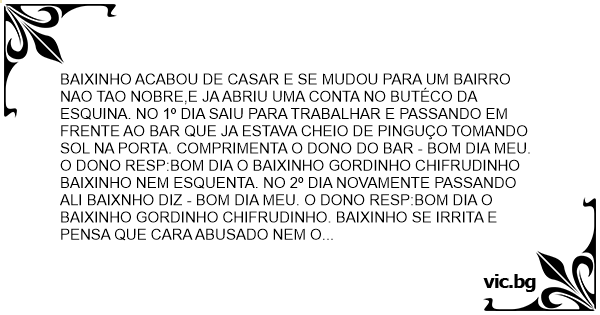 BAIXINHO ACABOU DE CASAR E SE MUDOU PARA UM BAIRRO NAO TAO NOBRE,E JA ABRIU UMA CONTA NO BUTÉCO DA ESQUINA. NO 1º DIA SAIU PARA TRABALHAR E PASSANDO EM FRENTE AO BAR QUE JA ESTAVA CHEIO DE PINGUÇO TOMANDO SOL NA PORTA. COMPRIMENTA O DONO DO BAR - BOM DIA MEU. O DONO RESP:BOM DIA O BAIXINHO GORDINHO CHIFRUDINHO BAIXINHO NEM ESQUENTA. NO 2º DIA NOVAMENTE PASSANDO ALI BAIXNHO DIZ - BOM DIA MEU. O DONO RESP:BOM DIA O BAIXINHO GORDINHO CHIFRUDINHO. BAIXINHO SE IRRITA E PENSA QUE CARA ABUSADO NEM O CONHEÇO DIREITO E VEM COM ESSAS LIBERDADES TODA. NO 3º DIA BAIXINHO JÁ VEIACO COMPRIMENTA COM A VOS MAIS GROSSA - BOM DIA MEU. O DONO RESP:BOM DIA O BAIXINHO GORDINHO CHIFRU DINHO. BAIXINHO SE ENFESA VOLTA EM CASA DERRUBANDO A PORTA TOMBANDO A GELADEIRA E DIZ PARA A MULHER -QUE VC. ESTA APRONTANDO, QUE TODOS OS DIAS PASSO EM FRENTE AO BAR, VEJO TODOS SORRINDO E O DONO ME CHAMA DE CHIFRUDINHO?? - VOU MATAR OS DOIS. A MULHER MUITO SÁBIA DIZ, COM VOS MEIGA - CALMA BEM ISSO É CONVERSA DE BUTEQUEIRO VC. SABE QUE ESSES CARA NAO PRESTAM. COM MUITO SACRÍFICIO ACALMA O MARIDO, QUE VAI TRABALHAR ATRASADO. NO 4º DIA BAIXINHO JÁ SEM PACIENCIA COMPRIMENTA O CAMARADA COM UM TOM DE VOS DE BOTAR MEDO EM QUALQUER UM -BOM DIA MEU O DONO RESP:BOM DIA O BAIXINHO GORDINHO CHIFRUDINHO FUCHIQUEIRINHO.